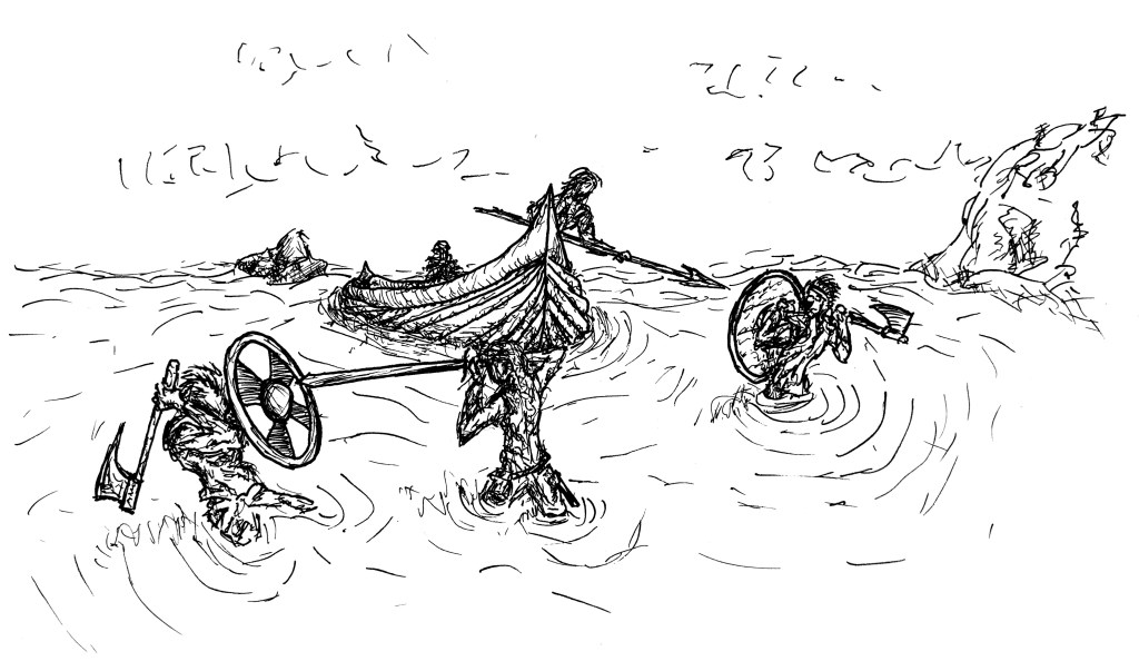 “Come on!”, I yelled as I leapt off the trail, taking the much steeper and uneven direct path. I heard Elstan follow. This choice was likely the culprit for most of the next week’s ankle pain but it was the only way to prevent their escape. The older man had been lifted in and the stronger man had leapt aboard when we caught up with them. The woman was still hip deep in water when I reached the shore and she made the choice to fight instead of risk being stabbed from behind as she hauled herself aboard. She took a shield from the boat, pulled her axe from her belt, and readied herself.
