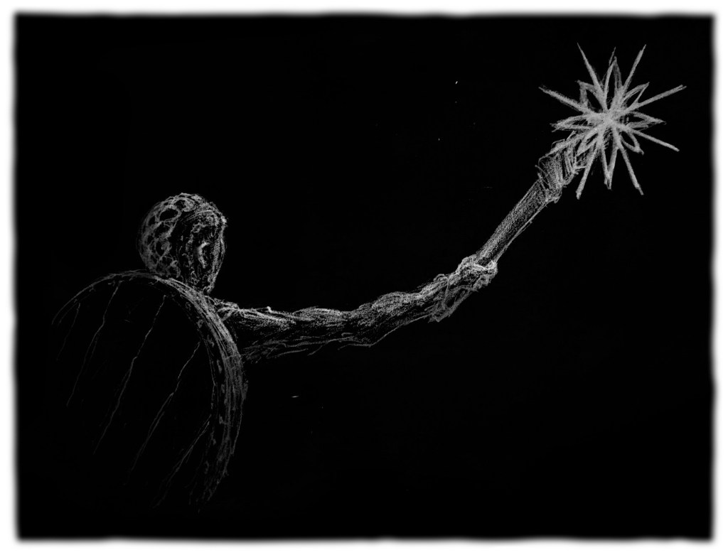Then the mass retaliated. It launched a tendril forward, over me, to affix to the ceiling behind me and use to pull itself forward, launching towards my head. I did not retreat. The tunnel was wide enough to swing the blade so I brought it up in a wide circle, almost a parry. I did not sever the tendril, I could see sparks as the blade struck one of the undulating stones that had bobbed to the skin’s surface. But the force of the blow knocked the tendril free from the ceiling and, by losing its anchor, the advancing mass was knocked off course.
