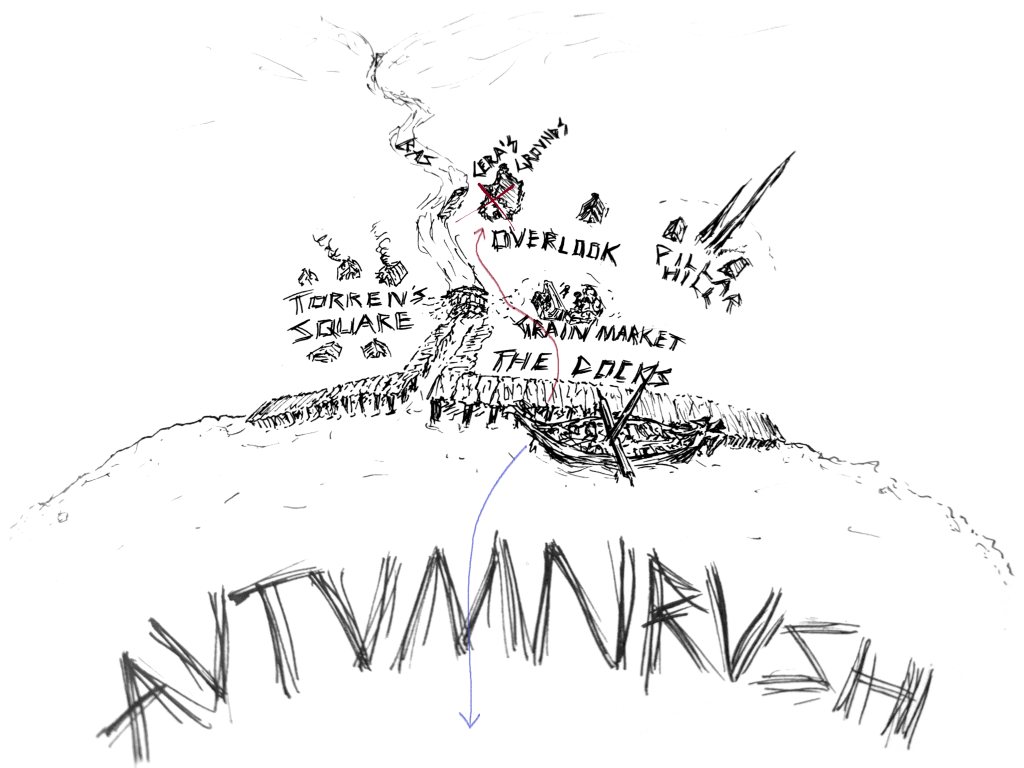 They had been expecting us. Nisas of Tidemark, captain of the Starving Wolf, the crimson sailed warship that the Sustainers and I had passed a week prior when arriving to Autumnrush, was waiting for us on the small dock along with a dozen other well armed sailors. I had never met a warcaptain before but he matched how I’d imagined one to look. Boisterous yet unbothered. Imposing, but not so large that it slowed him down or that he could not bound across a plank. Dark hair and bright eyes.