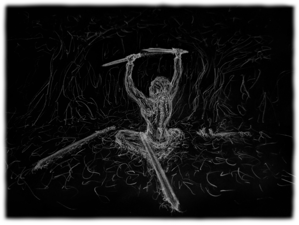The darkness again, hazy shadows, the weak glow from the beacon far behind us. Verena gave a despondent groan. I froze. Then I heard the crunch of leaves from the darkness. I wanted to swing the blade, but Verena was at my side, I could not do so blindly and risk hitting her or the children. I felt I could do nothing but wait for what was to come. But the blade didn’t need light, it had no eyes, it only desired  to follow the thread, to arc towards the blood. It would not allow me to freeze, it dragged me forward and I did not resist.