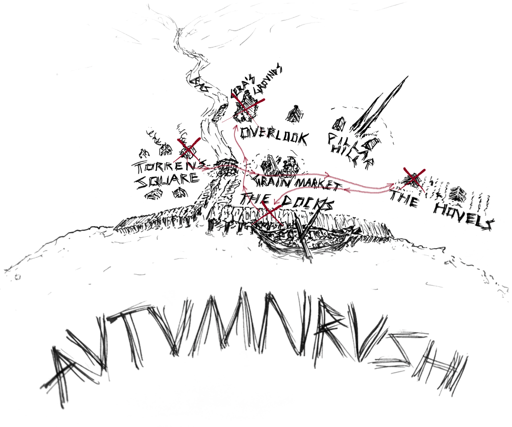 I refocused and turned back from the Pillars, looking forward again, towards our task. I had been wandering, idly strolling, as if I’d known the paths well enough that I did not need to heed them to find my way. But I did not know those streets well, they still terrified me, and I had never been to the Hovels. I should have been lost, the thread must have carried me.