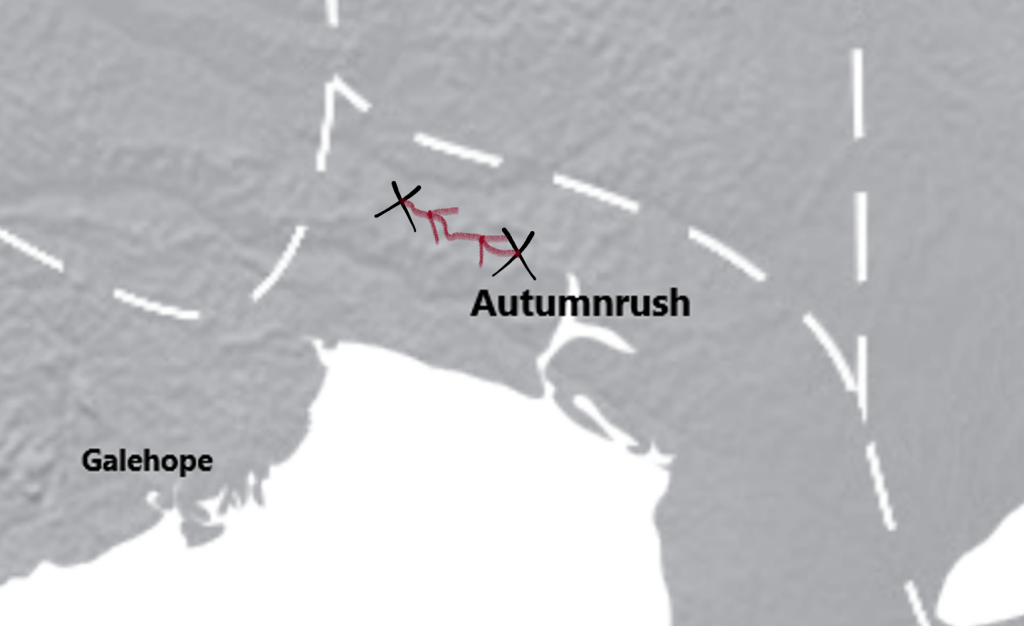 It wasn’t until I’d crested the first broad hill that I paused to catch my breath and looked back to the way I’d come. Autumnrush was no less impressive from the west than it had been from the south when I’d first arrived with the Sustainers weeks prior. The tendrils reflected off of the fjord, further illuminating the port and pulsing and dancing across the Twin Pillars. I tried to make out Cera’s longhouse upriver to my left, but from that far west, most of the Overlook was swallowed by the Valley Bas.