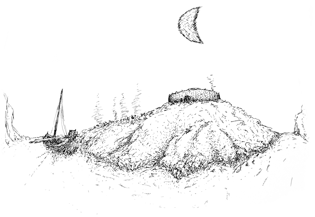 Then Mira ordered we row to the island, the one we had originally planned to shore on for the night. Haf’s map identified it as “Spotter’s Ridge.” There was indeed a ridge, high enough to spot things from. I wondered if they had watched us from that same ridge before they attacked. In silence, the crew pulled for the flat beach on the eastern shore. We reached it as dusk faded. The Swan was shored and camp was quickly prepared, racing against the thickening clouds that would soon take the moon’s light.