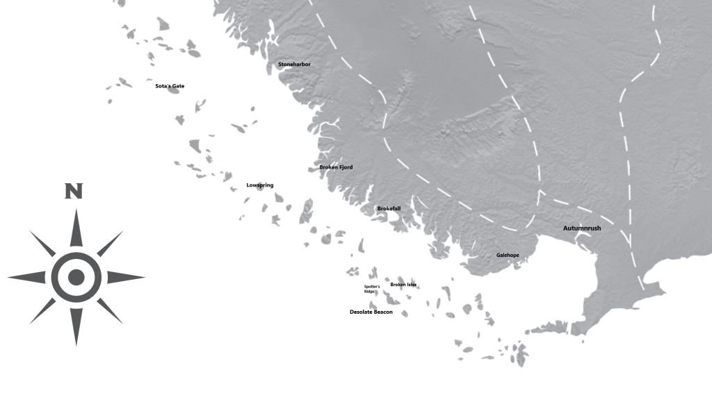 Mouth’s Watch – An island fortress at the mouth of the fjord built in fear that the Skulde might follow from the Old World. Generations abandoned and only recently occupied by agents of the Western Reach.